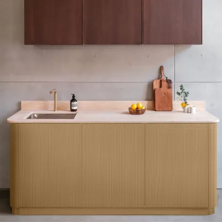 Plissé is a form of facade composed of half-cylinders positioned edge to edge. You can enhance it with a profiled handle or choose the push to open system from Leroy Merlin. You can choose to mount the front on the right or left. To be completed with hinges sold separately from Leroy Merlin. The pleated shape is only on the front. The back is smooth.