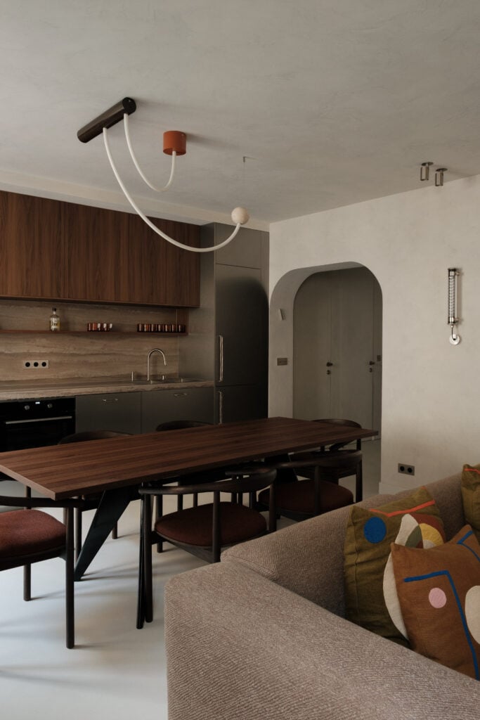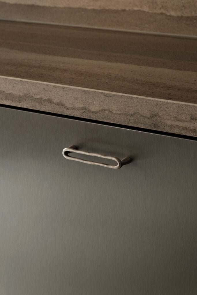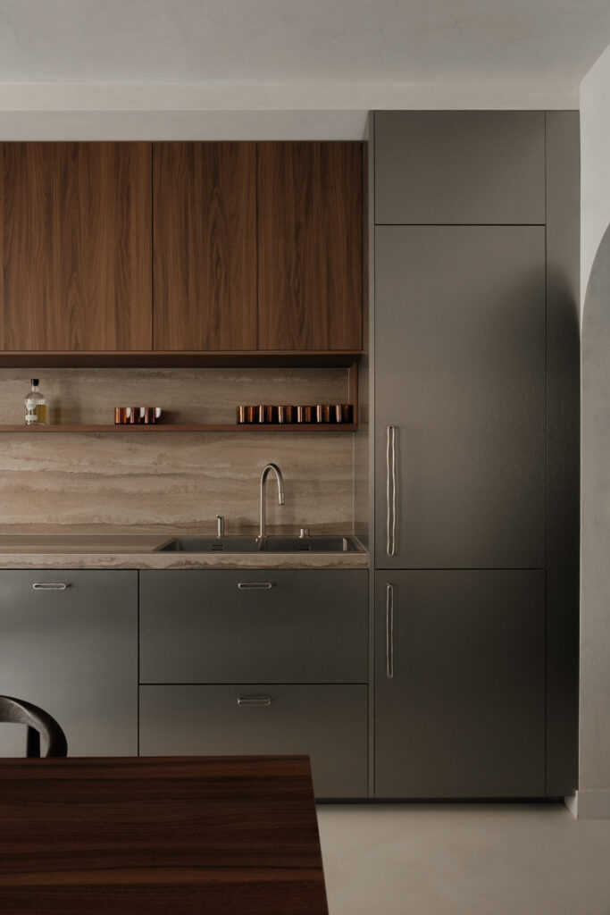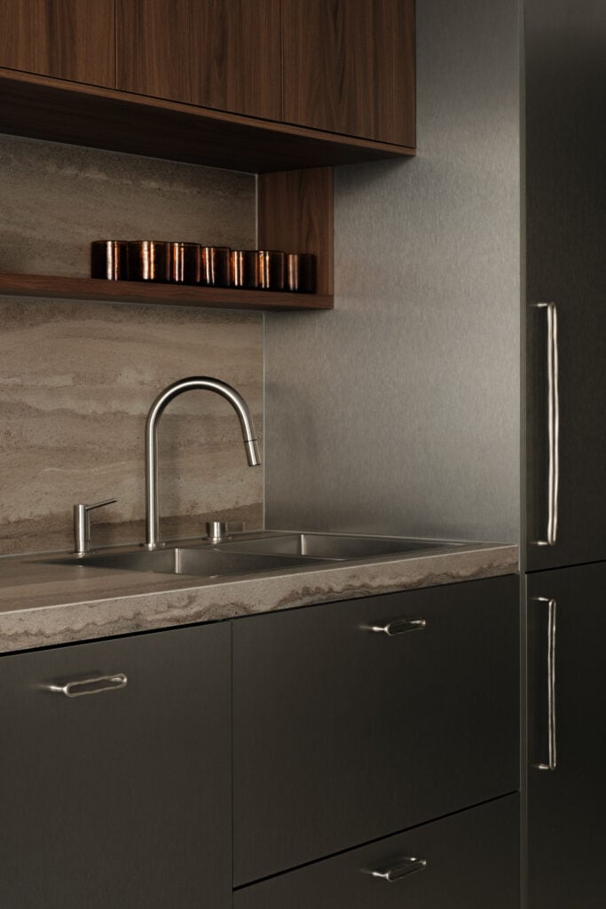 Associé au bois, l’ensemble gagne en profondeur. La chaleur du veinage vient tempérer l’éclat de l’acier, et la cuisine trouve sa juste présence : technique, mais domestique. Une écriture architecturale où chaque détail compte, du geste de la main aux lignes de fuite.