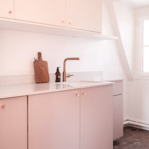Dans cette cuisine, le souhait est de conserver les tomettes d’époque tout en trouvant des couleurs de façades qui se marient parfaitement avec elles. Grâce à nos échantillons, leur choix s’est porté sur la couleur Rose des Sables en Laque Mate. Cette couleur s’harmonise merveilleusement bien avec les tomettes, créant une ambiance douce et lumineuse dans la cuisine. Afin d’assurer une harmonie visuelle, le choix s’est également porté sur le Blanc Pur de notre nuancier pour les meubles du haut. Ceci permet d’aérer l’espace tout en apportant une impression d’agrandissement de la pièce.