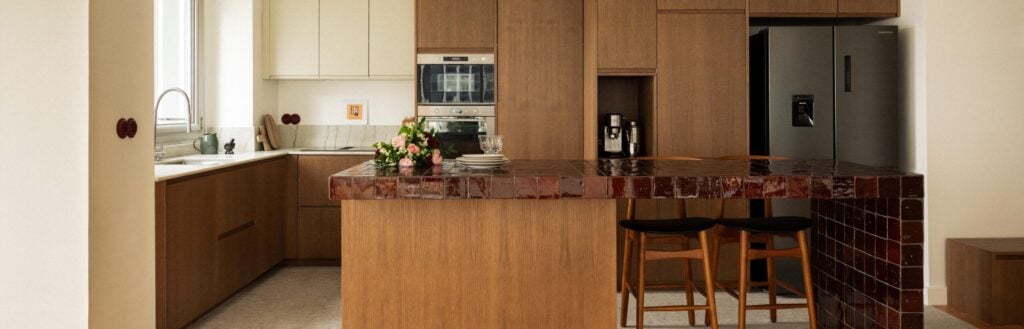 Cuisine avec îlot en zellige brun et façades Bocklip en chêne Arabica